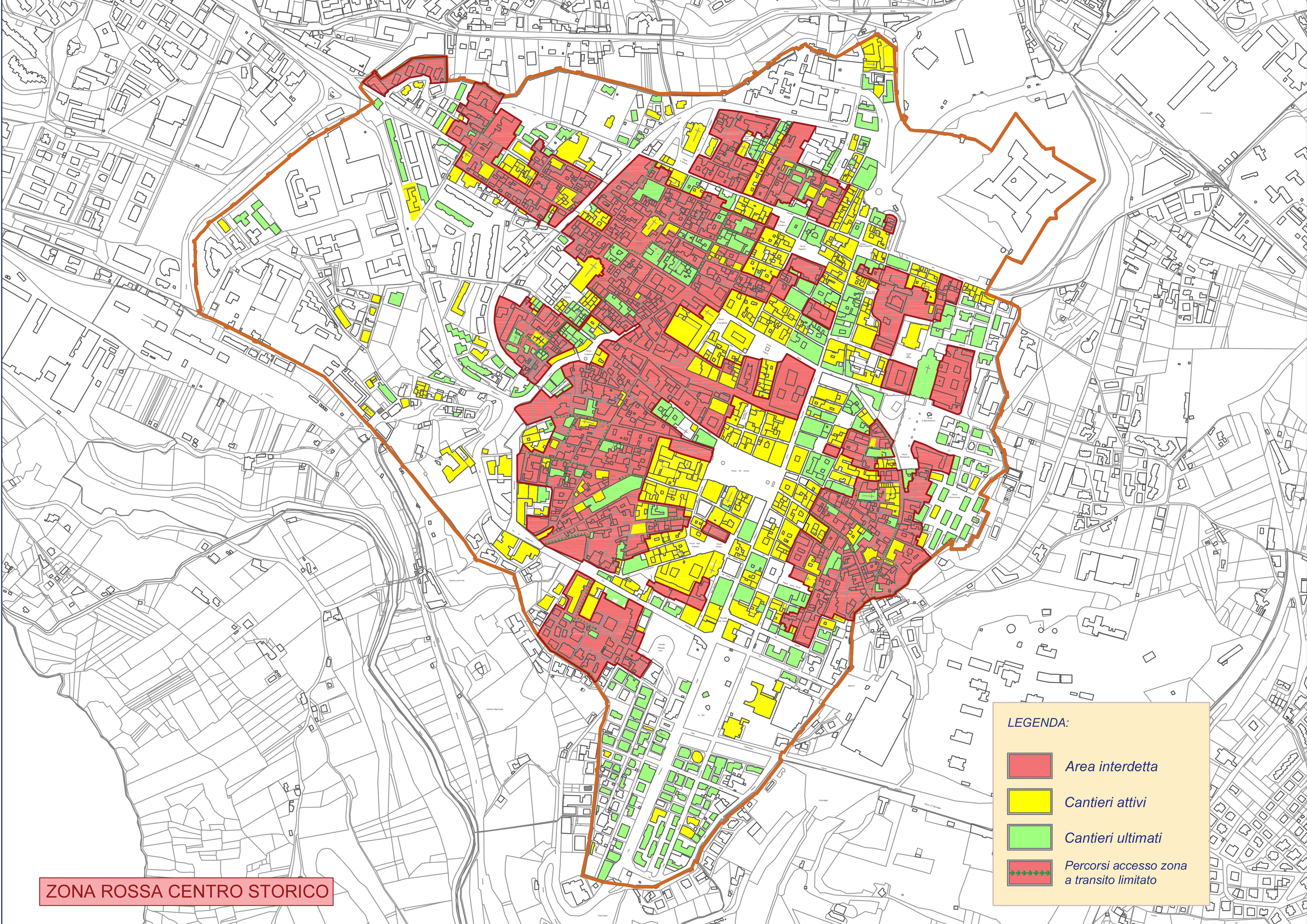 L’AQUILA La zona rossa del centro storico della città dell’Aquila è stata aggiornata. “Il sindaco Visto il D.Lgs. n° 267 del 18.08.2000 artt. 50 e 54; ordina L’istituzione dell’area denominata “Zona rossa” del centro storico cittadino così come definita nell’elaborato grafico allegato, redatto dagli uffici tecnici comunali ed aggiornato alla situazione cantieri a tutto il 27.07.2017, e la conseguente interdizione al pubblico transito nella medesima ad eccezione dei soggetti debitamente autorizzati”.