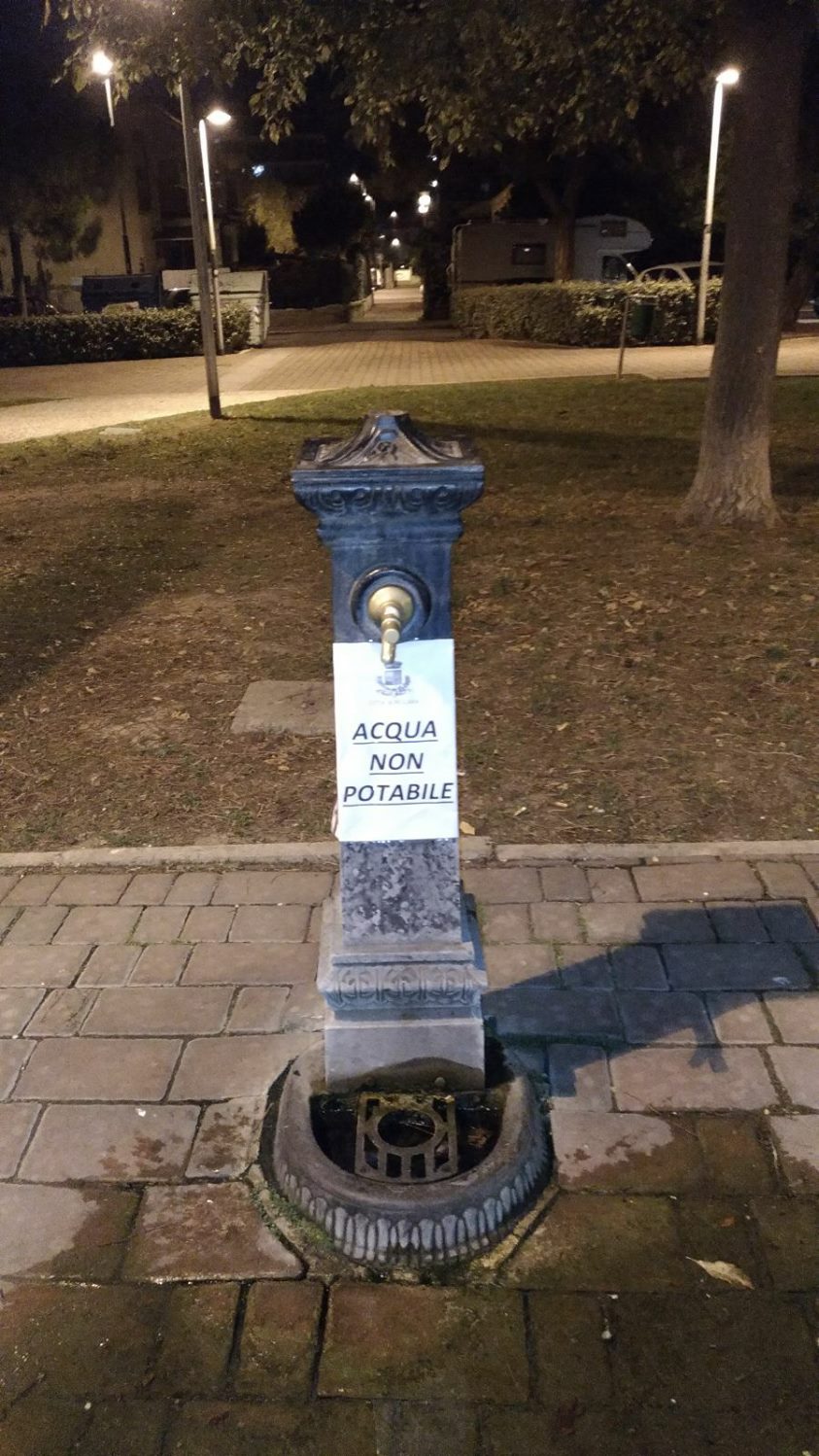 Questa situazione segue quella del 9 e 10 settembre quando furono chiuse una fontanella alla Pineta dannunziana (per un superamento per Ferro e Manganese; poi il provvedimento è stato esteso anche alle altre fontanelle del parco per presenza di coliformi al pre-contatore) e a Via del Santuario. Per quest’ultima non vi sono state mai spiegazioni circa il tipo di criticità riscontrata (nell’ordinanza si parlava genericamente di superamento dei limiti senza dire per quale parametro).