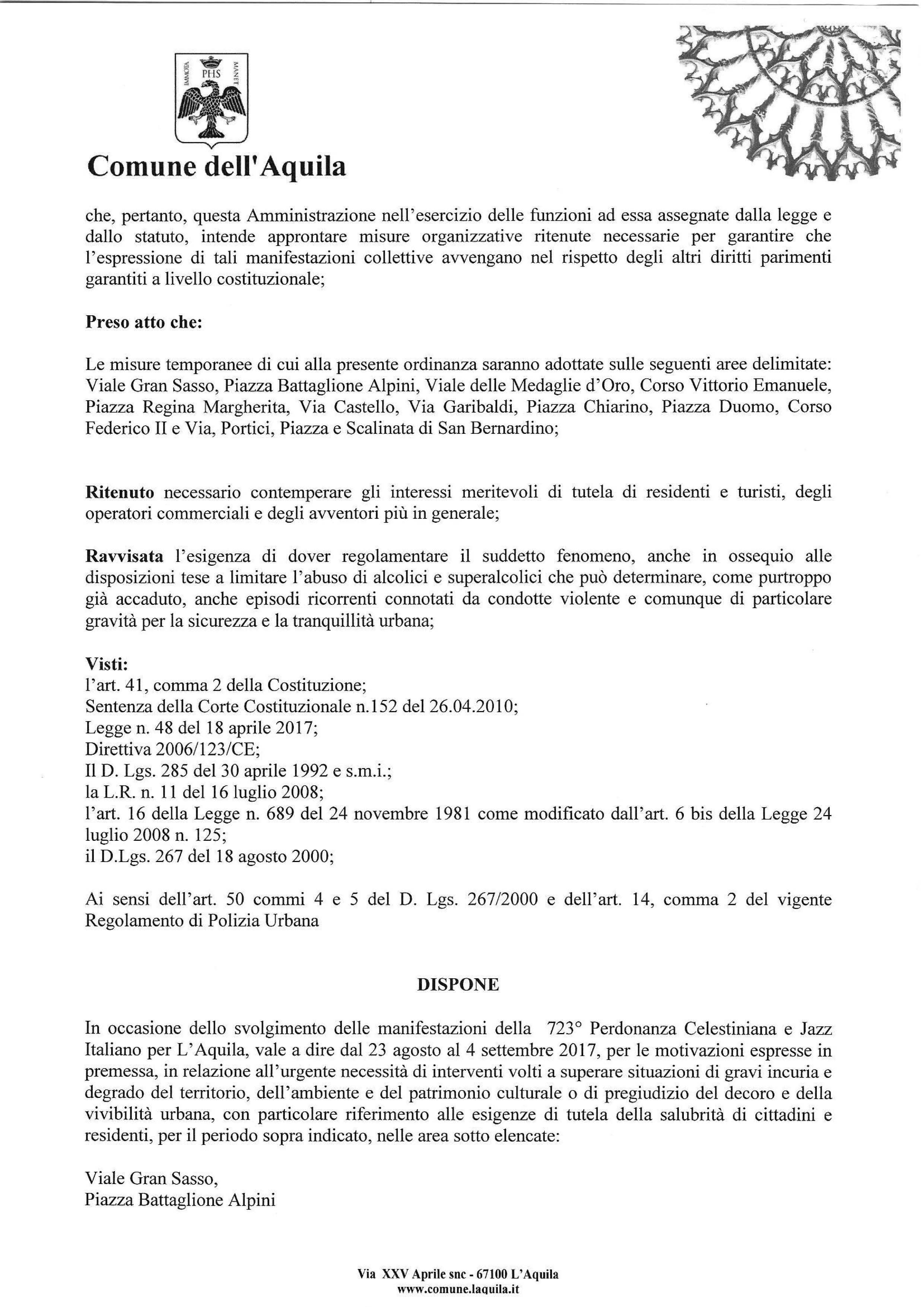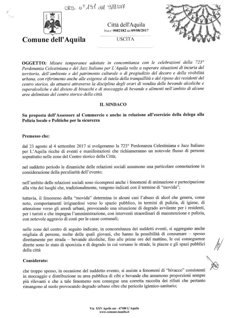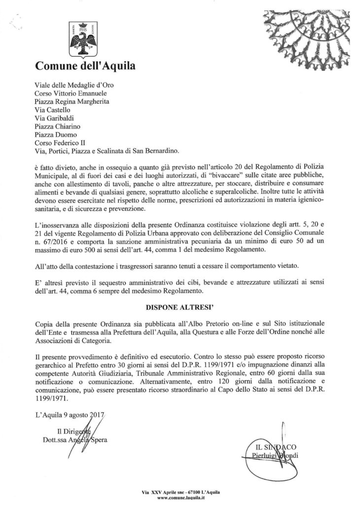 L’AQUILA E’ stata pubblicata all’albo pretorio on line e sul sito internet del Comune l’ordinanza con la quale vengono adottate delle misure per superare situazioni di incuria del territorio, dell’ambiente e del patrimonio culturale con il divieto di bivacco e di stoccaggio di bevande e alimenti in aree delimitate del centro storico.
