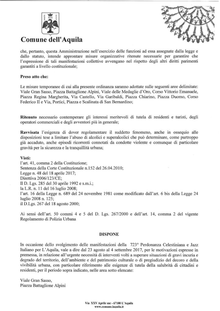 Perdonanza Celestiniana 2017 e Jazz Italiano per L’aquila, le misure adottate dal Comune