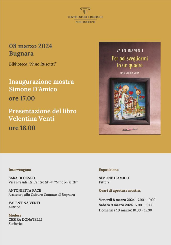 BUGNARA Venerdì 8 marzo 2024 a partire dalle ore 17.00, il Centro Studi e ricerche “Nino Ruscitti” ospiterà la mostra dell’artista sulmonese Simone D’Amico. A seguire la presentazione del libro di Valentina Venti “Per poi svegliarmi in un quadro” con la partecipazione della scrittrice Cesira Donatelli che dialogherà con l’autrice.