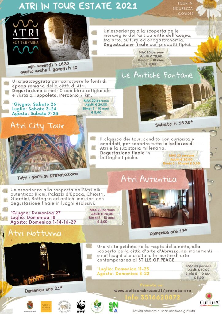 Gli appuntamenti sono a cadenza settimanale: ogni venerdì alle 16,30, Atri Sotterranea: Cisterne Romane, Grotte e l’Antica Filanda sono i protagonisti di questa parte “nascosta”. Al termine un ricco aperitivo con degustazione delle specialità locali. Il sabato (nelle seguenti date: 26 giugno, 3 – 24 luglio, 7-28 agosto) è dedicato, alla passeggiata per conoscere le Antiche Fontane. A domeniche alterne, invece, è possibile prendere parte ad Atri Autentica (27 giugno, 18 luglio, 1- 14-16 -29 agosto) e ad Atri Notturna (11- 25 luglio; 8 -22 agosto). Atri City tour è su prenotazione: è sufficiente contattare i recapiti indicati e concordare il giorno e l’ora per prendere il proprio appuntamento personalizzato con l’arte e la storia. Le attività sono rivolte ai soci; è possibile iscriversi gratuitamente e partecipare a tutte le iniziative che saranno presentate dall’associazione nel corso del 2021.