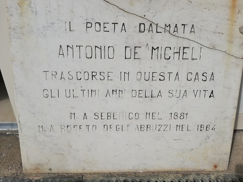 ROSETO Antonio De Micheli, irredentista, poeta, giornalista, insegnante e scrittore, morto all’ospedale di Pescara il 22 aprile 1964, all’età di 83anni, visse da esule gli ultimi anni della vita in Via Piave a Roseto degli Abruzzi (TE). Era nato a Sebenico (oggi Croazia) il 24 giugno 1881 ed era sposato con Giovanna Savio Gazzoni (detta Gina o Giannina) ed aveva due figlie: Biancamaria e Novella. Grazie alle ricerche del giornalista giuliese, Walter De Berardinis, con la collaborazione dello storico, Mario Giunco, già funzionario del settore cultura del comune di Roseto degli Abruzzi, è stata riportata alla “luce” la lapide rimossa, visto che giaceva sotto un fondaco nella stessa casa in cui visse fino agli ultimi giorni di vita insieme all’altro giornalista e scrittore teatino, Donatello D’Orazio (Chieti 1896 – Roseto degli Abruzzi 1986). Oggi la lapide è custodita da uno dei proprietari dell’immobile, la Sig.ra Lidia Panicciari, la stessa si è resa disponibile per il restauro e ricollocazione originaria del manufatto, in attesa che gli autori della scoperta cercheranno, con l’aiuto di enti privati e pubblici, di restaurare la lapide e ricollocarla nello stesso posto. Le ricerche sul poeta sono partite in occasione del centenario dell’Impresa fiumana di Gabriele D’Annunzio 1919/2019, dove furono protagonisti due Legionari giuliesi: Gaetano Montini e Flaviano Iaconi. Il De Micheli, sulle biografie ufficiali, viene erroneamente citato come luogo del decesso e della residenza la città di Giulianova. Il giornalista Dalmata arrivò a Roseto degli Abruzzi come esule, dopo i noti fatti della fine della 2° Guerra Mondiale, in cui ci fu l’esodo forzato degli italiani (per etnia e lingua) dalla Venezia Giulia e dalla Dalmazia, che porto oltre 350.000 persone a lasciare la propria terra natia dopo l’occupazione da parte degli uomini di Tito e della nascente Repubblica Federativa Popolare di Jugoslavia. A Roseto fu accolto dal collega Donatello D’Orazio e dalla nobildonna, Angela Scavongelli Giannuzzi.