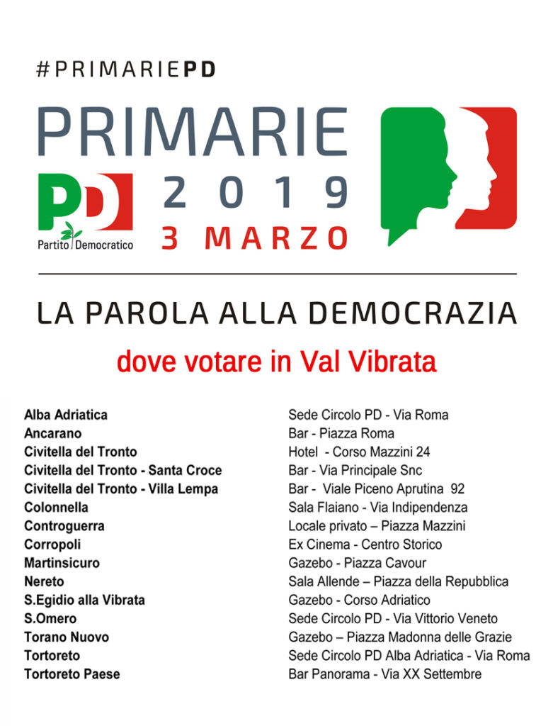 VAL VIBRATA Domenica 3 marzo sarà possibile votare per le primarie del Partito Democratico nei paesi della Val Vibrata. Ricordiamo che si vota dalle 8 alle 20. Sarà possibile scegliere tra i tre candidati a segretario del PD: Roberto Giachetti, Maurizio Martina e Nicola Zingaretti.