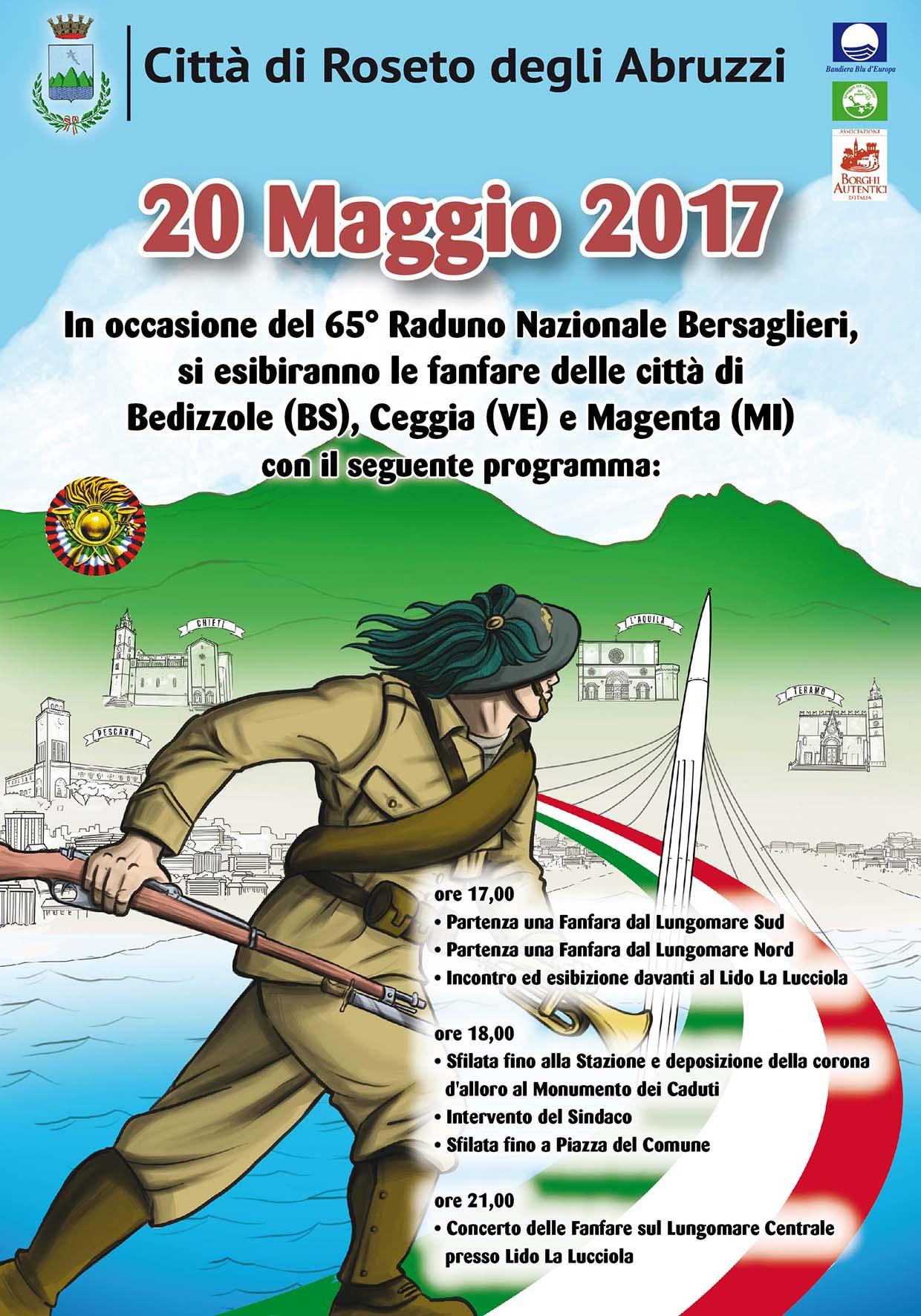 Sabato 20 maggio, nell’ambito del 65° Raduno nazionale dei bersaglieri, anche Roseto ospiterà diverse fanfare. L’iniziativa, del Comune, prevede l’esibizione delle fanfare dei bersaglieri delle città di Bedizzole (Brescia), Ceggia (Venezia) e Magenta (Mi).