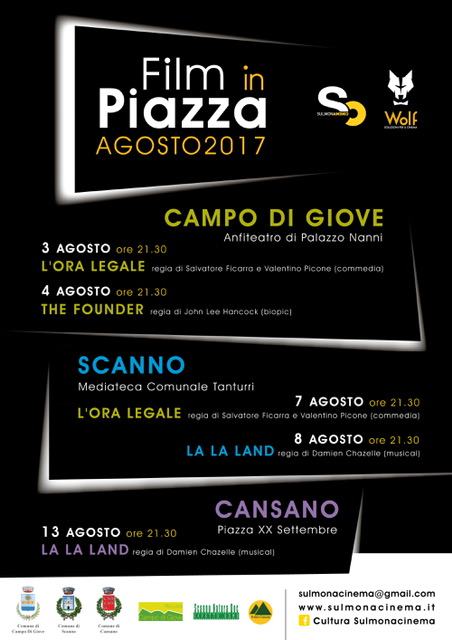 SULMONA (L’AQUILA) Come ormai è tradizione, Sulmonacinema ad agosto porterà il cinema nelle piazze di alcuni dei più bei borghi dei dintorni. Grazie all’accordo con istituzioni, pro loco e associazioni culturali sarà possibile infatti gustare gratuitamente cinque film per un totale di cinque serate di cinema all’aperto a partire dal 3 fino al 13 agosto.