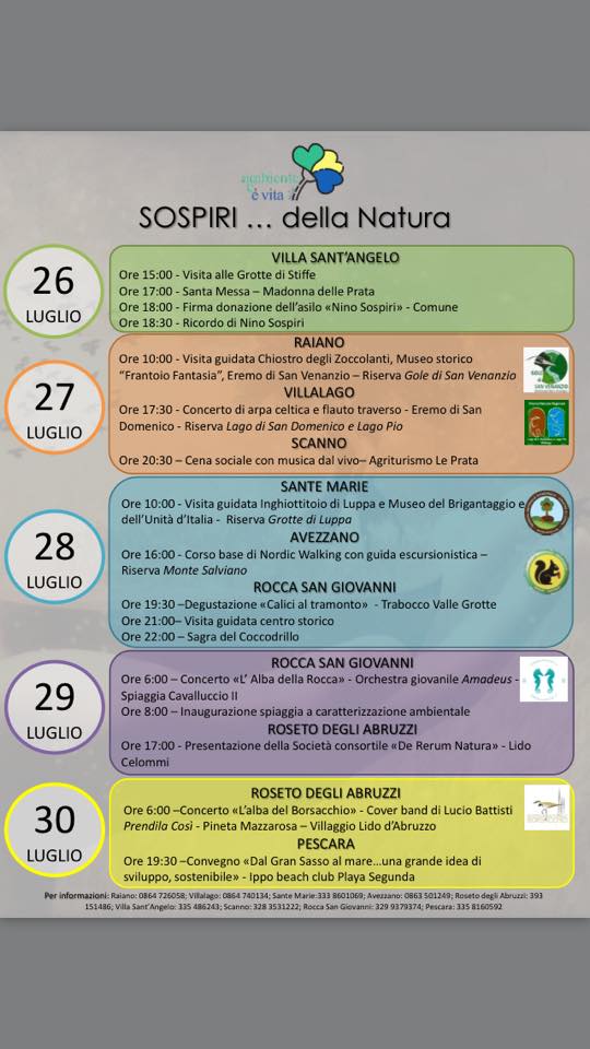 Mercoledì 26 Luglio si inizierà con la visita alla grotte di Stille a Villa Sant’Angelo (AQ). Giovedì 27 Luglio si visiteranno nella Riserva delle Gole di San Venanzio a Raiano (AQ) il Chiostro degli Zoccolanti, illo Museo Storico “Frantoio Fantasia” e l’eremo di San Venanzio. A seguire la visita alla Riserva Lago di San Domenico e Lago Pio a Villalago (AQ) dove presso l’eremo di San Domenico si svolgerà un suggestivo concerto di arpa celtica e flauto. Venerdì 28 Luglio si visiterà la Riserva Grotte di Luppa a Sante Marie (AQ) . Nella serata ci si sposta nel chietino con l’evento “Calici al Tramonto” nel Trabocco Valle Grotte e la Sagra del Coccodrillo. Sabato 29 Luglio a Rocca San Giovanni (CH) al concerto “L’Alba della Rocca”. La settimana di eventi si concluderà domenica 30 Luglio a Roseto degli Abruzzi (TE) con il concerto “L’alba del Borsacchio” e a Pescara, città n tale del fondatore dell’associazione, dove si svolgerà il convegno “Dal Gran Sasso al mare…una grande idea di sviluppo, sostenibile”.